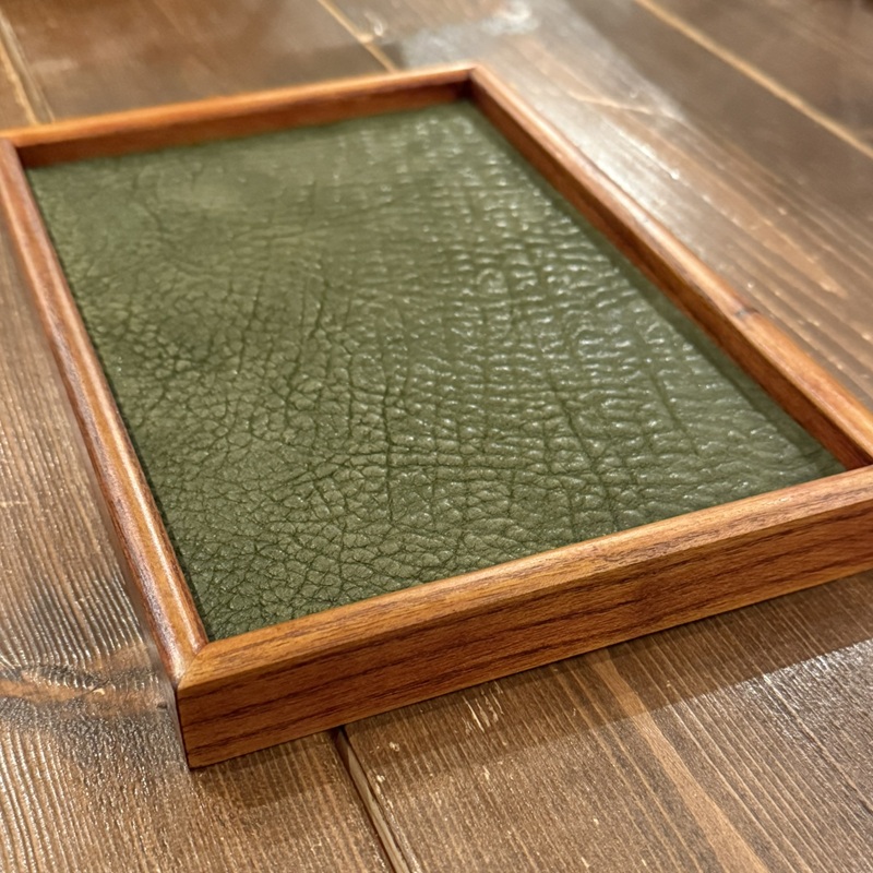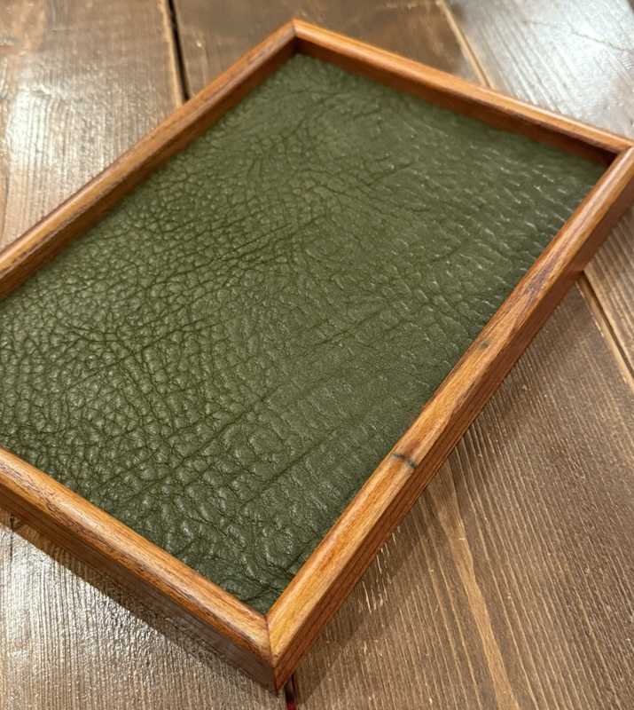 当店の強みは「革」です。資材屋さんと相談・交渉を行って既製品の天然木トレーを仕入れてそのサイズに合わせて革を加工して・・・という通常のトレーの販売店にはできない工程を行えているからこそ、この価格帯が実現可能となっております。