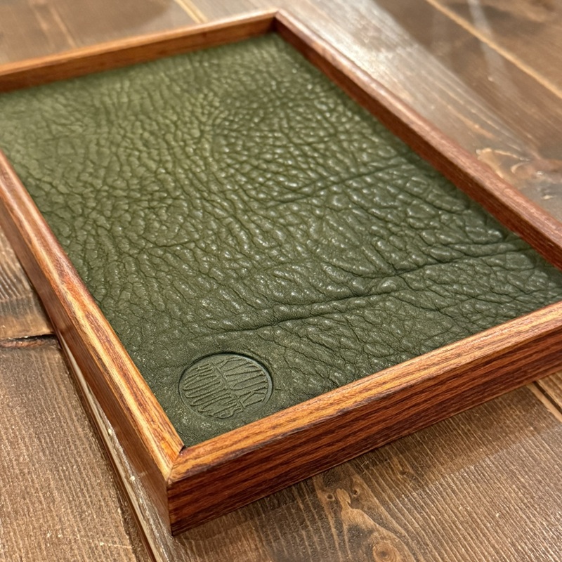 こちらの商品はスエードレザーをマットに使用した「WOOD TRAY R」や「WOOD TRAY L」とは異なり、シボの大きさや間隔のムラが大きく出ている革(Irregular Grain)をマットに使用した特別仕様となります。