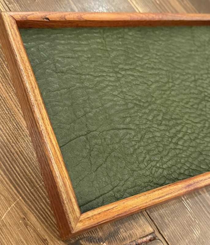 当店の強みは「革」です。資材屋さんと相談・交渉を行って既製品の天然木トレーを仕入れてそのサイズに合わせて革を加工して・・・という通常のトレーの販売店にはできない工程を行えているからこそ、この価格帯が実現可能となっております。